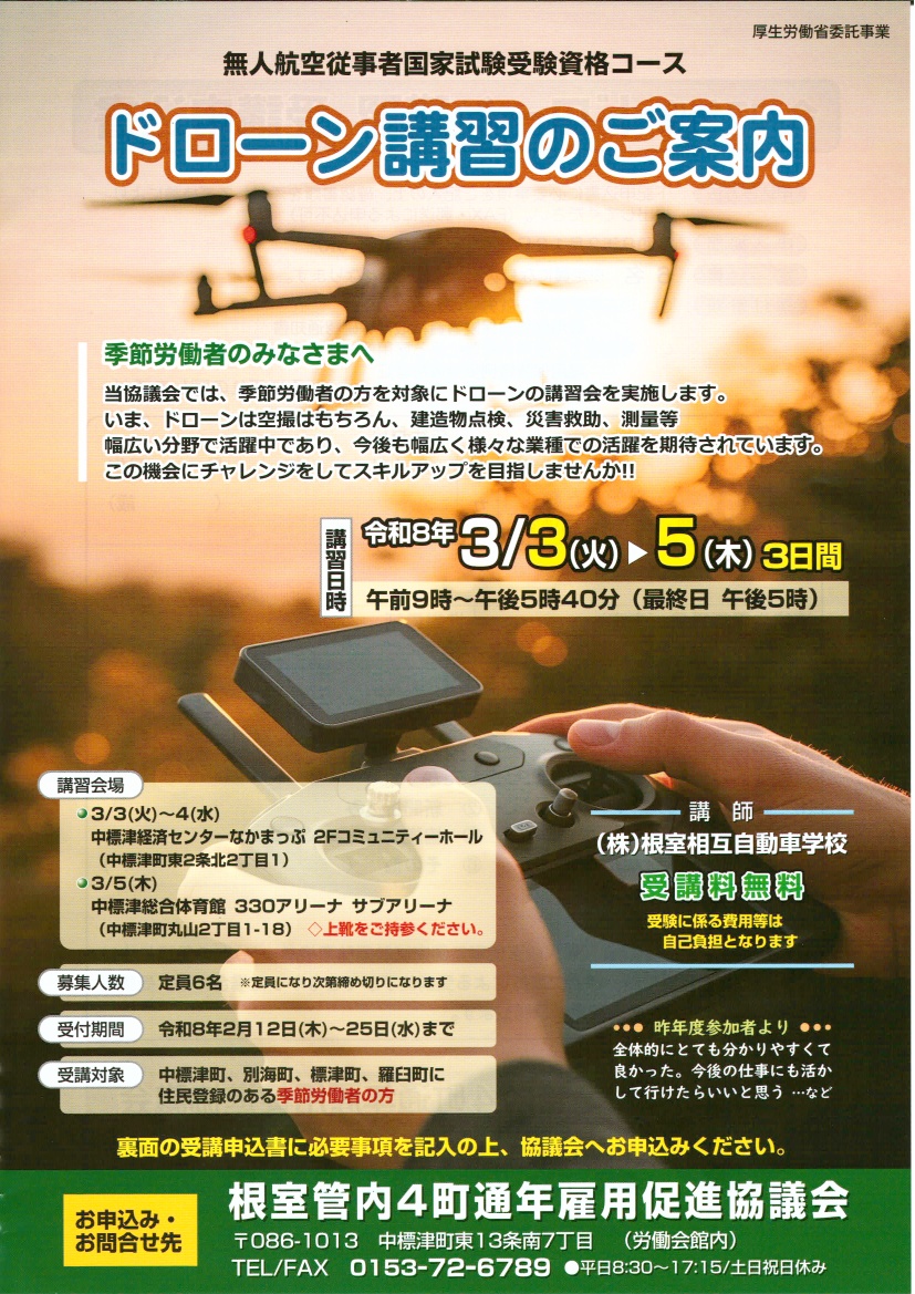根室管内4町通年雇用促進協議会では、季節労働者の皆様を対象に「ドローン講習」を開催いたします。