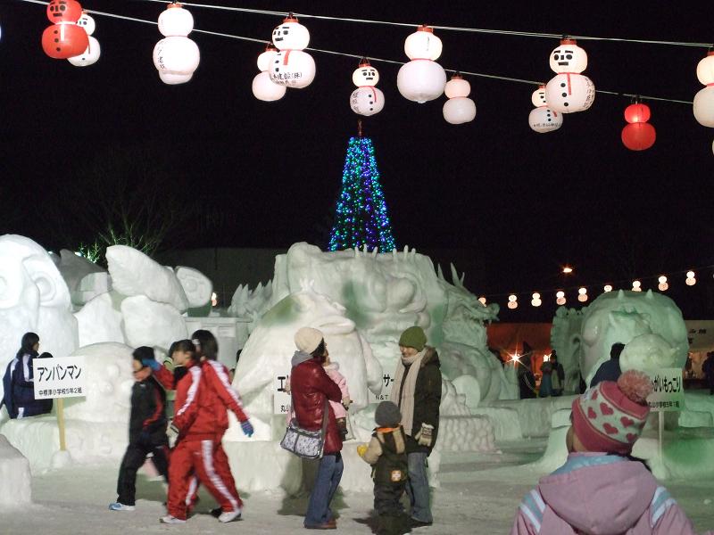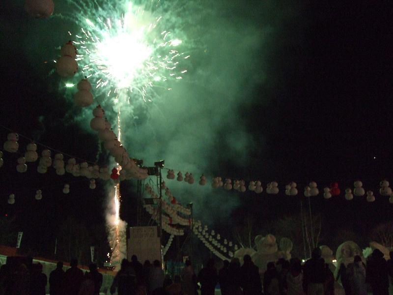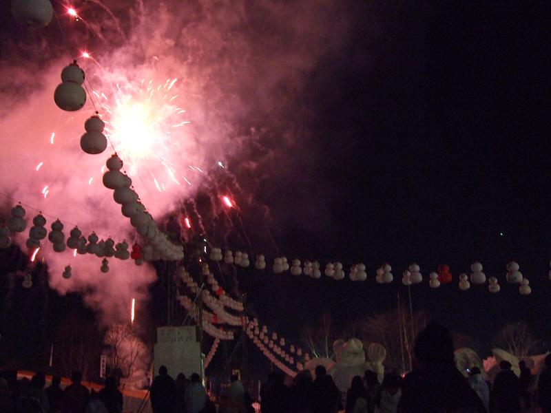 雪だるまの形をした、赤い提灯・白い提灯で会場を飾られた冬まつり、冬の花火はとっても綺麗