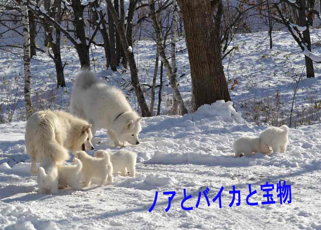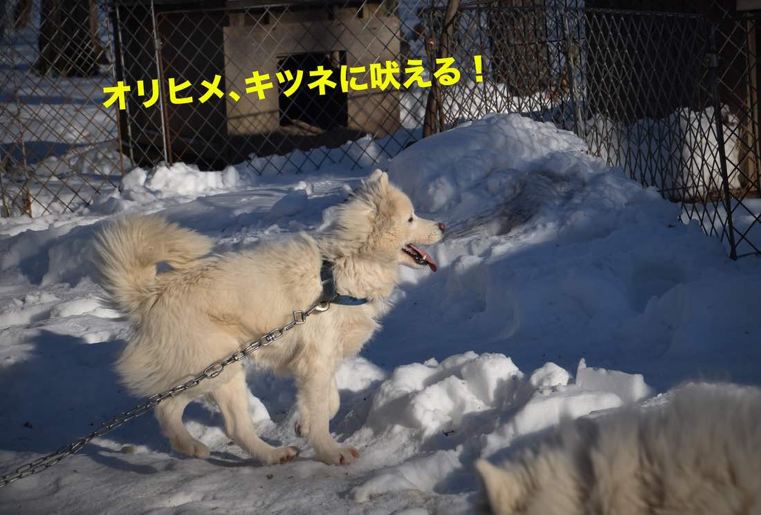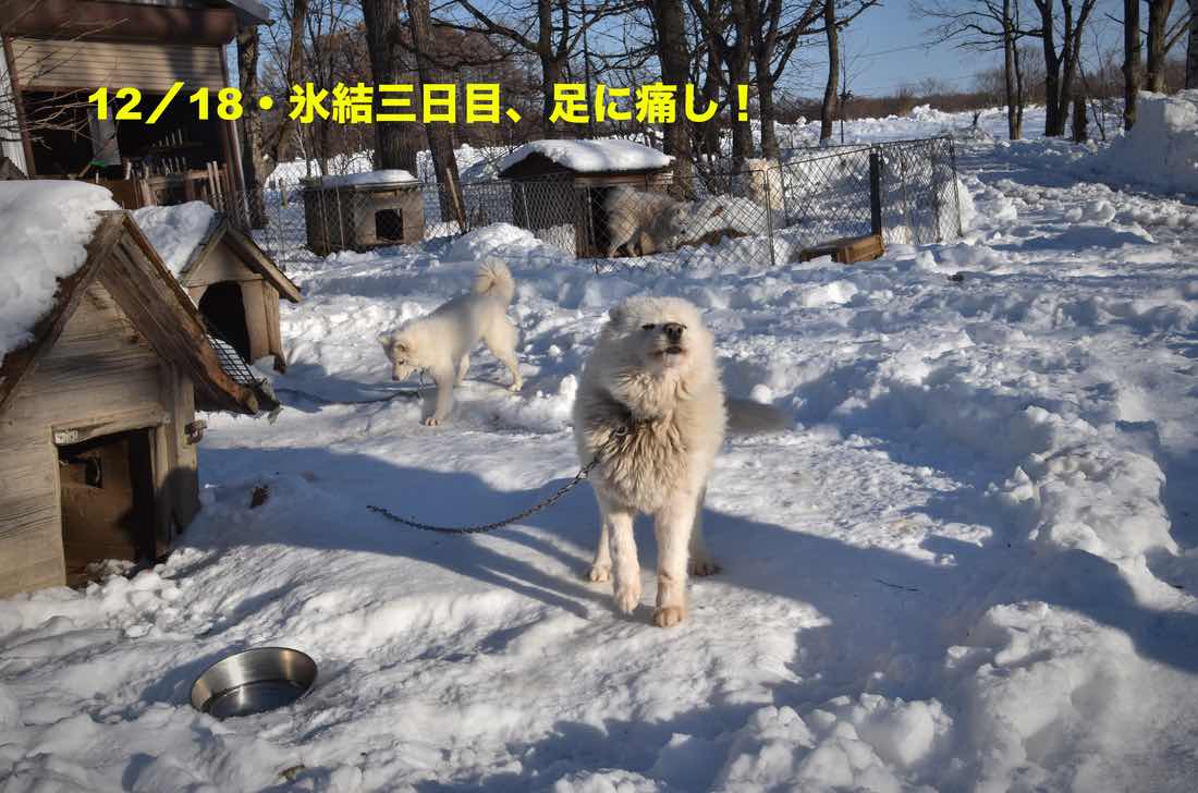 さて犬たちです。軽く舞い飛ぶ雪ではなかったので小屋が吹き溜まりの下、と言うことはありませんでした。小屋の前が高くなり、それを除雪すれば問題解消でした。気温は高かったので(−1℃〜+3℃)、脚を重い雪にとられながらも元気に弾けてました。