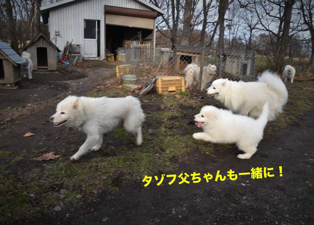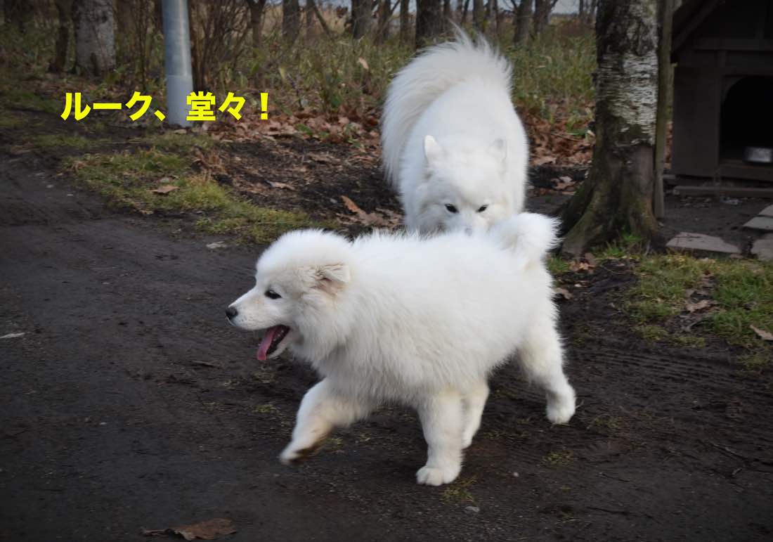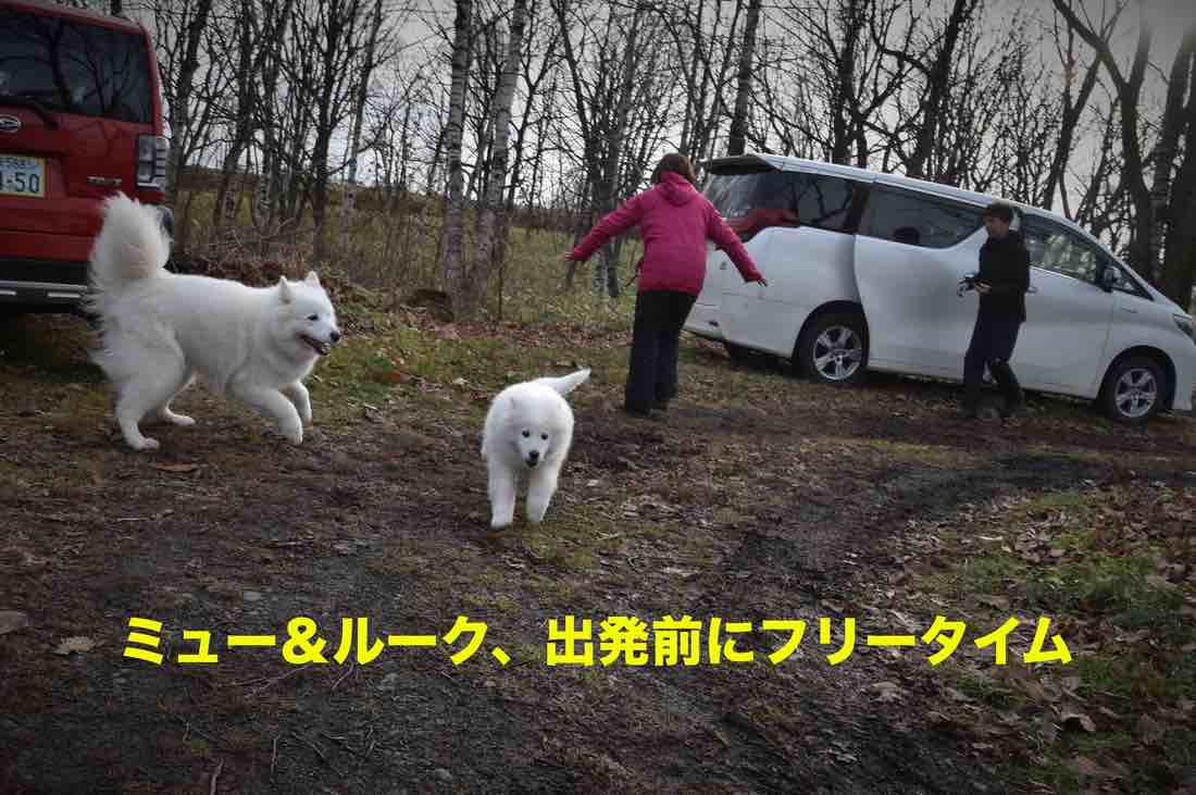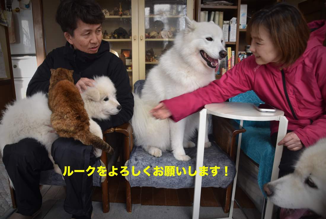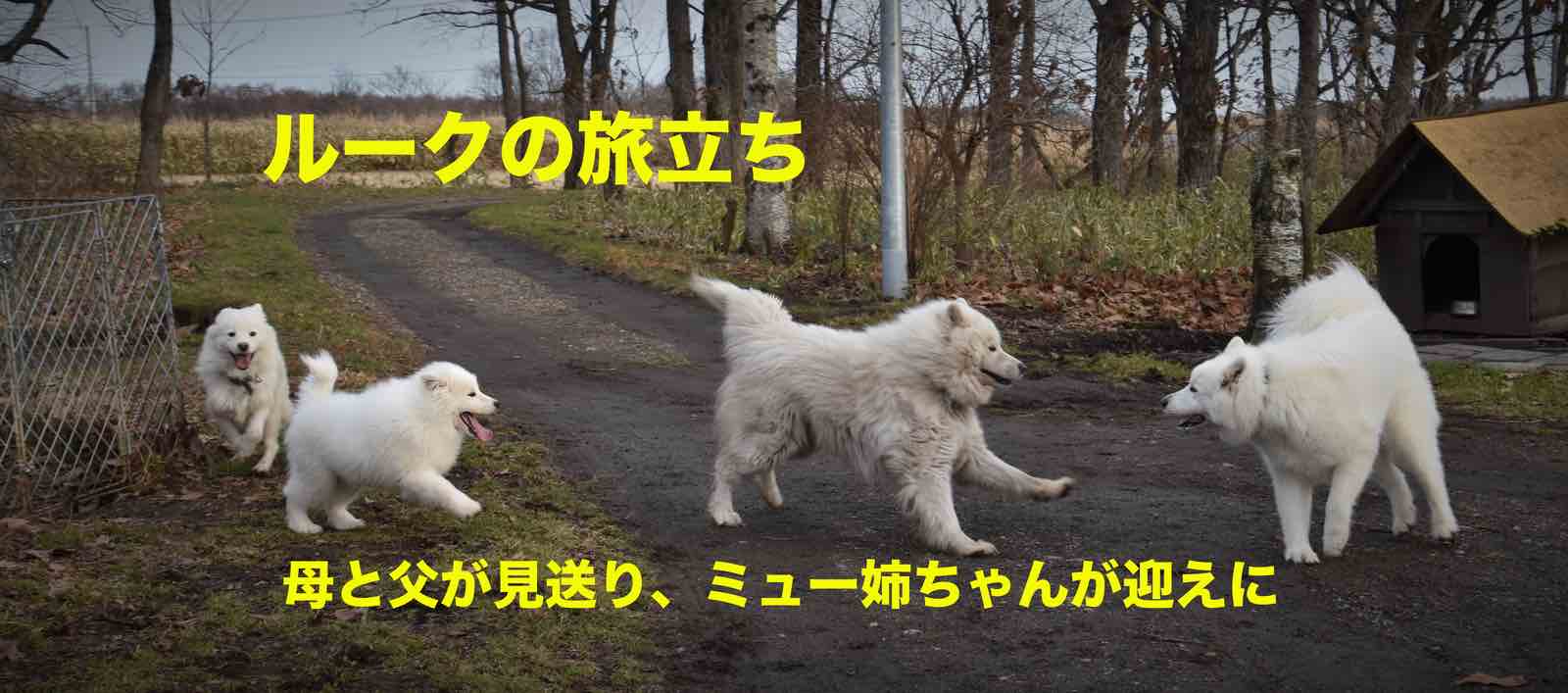 『師走の二日』 雪はないけれどきりりと冷えた初冬らしい好日。札幌からアンラっ子のミューを伴ってMさんご夫妻が来てくれました。はいっ、サモっ子のルークの迎えに…です。 物おじせずに雰囲気を理解したルーク、ミューと楽しいコンビをつくるでしょう。 写真、左からオリヒメ母ちゃん、舌出しルーク、タゾフ父ちゃん、そして迎えのミューです。