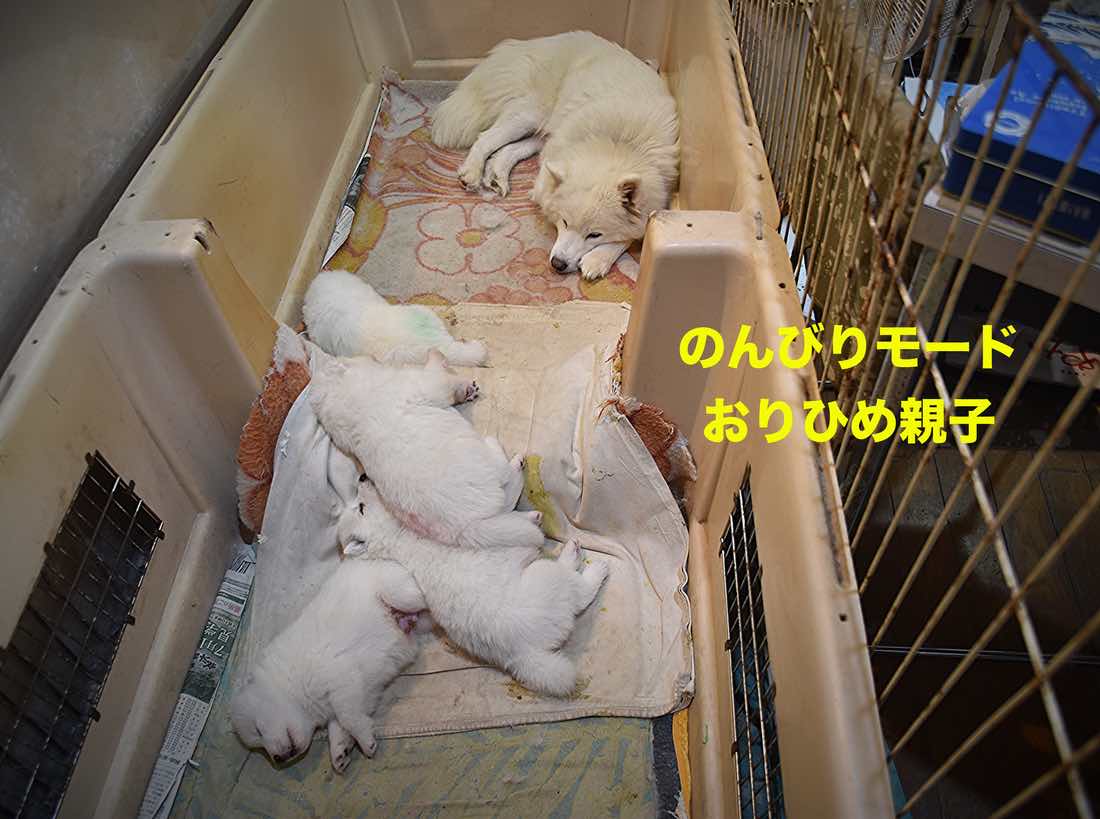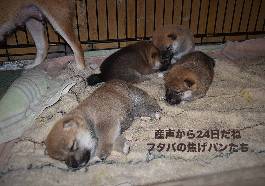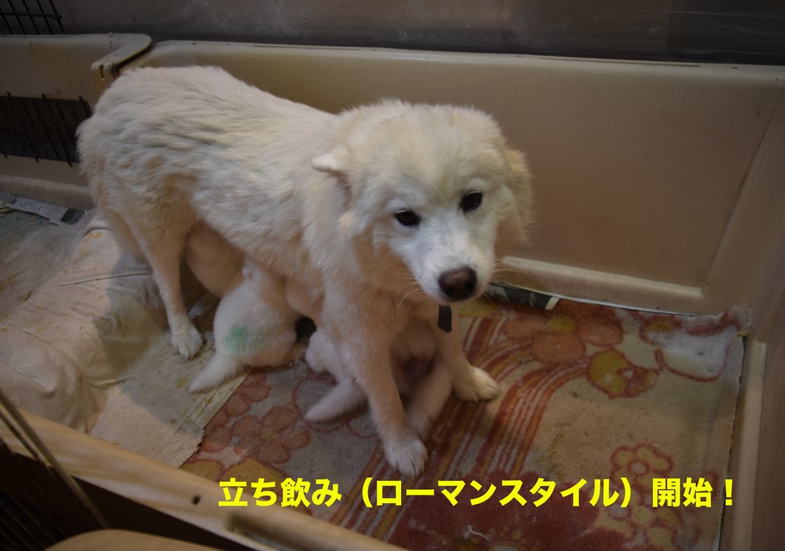 一昨日から2組の子犬たちが、立っているお母ちゃんの腹部を探るようになりました。はいっ、立ち飲みの開始です。